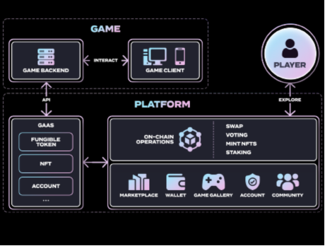 各个游戏和平台之间的连接是通过TimiBox Gaas解决方案来实现的。其中包括平台API(帐户API、NFT API、代币API等)以及一系列旨在简化开发人员流程的链上和链下工具。