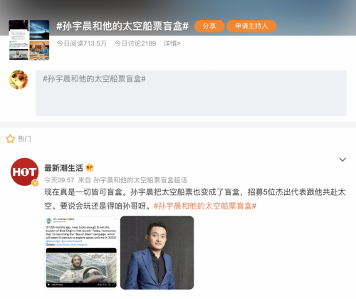 现阶段,各国的航天技术持续发展,社会资本和大众对航天的关注度也在不断提高。近日,孙宇晨的“星辰大海”计划在开通微博超话#孙宇晨和他的太空船票盲盒#后,就迅速引发网友热议。@科技发现、@最新潮生活 等多位拥有超百万粉丝的科技博主、原创博主均发言表示,孙宇晨的“星辰大海”计划只是第一步,这一计划终将激励更多人去实现他们的太空探索梦想。不少网友也留言表示“这是一次伟大的公益活动,希望有更多的人能够知道,了解和参与”。