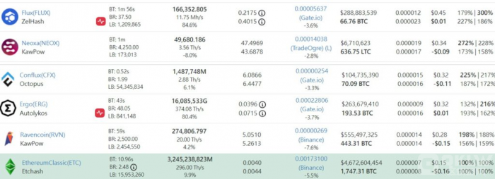 以太坊合并后ETC币、RVN币、ERGO币算力飙升,ETHW币算力如何?