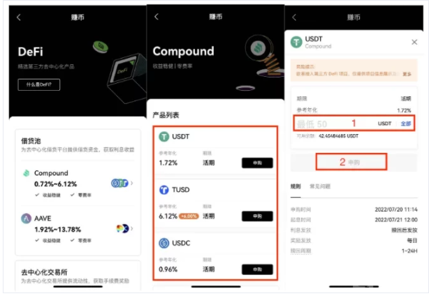 2、选择你要参与的产品,以【Compound】为例 — 选择USDT【申购】;输入【申购数量】—【申购】,按要求完成操作。