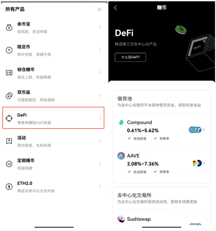 DeFi服务是欧易打造的一款帮助用户快捷参与链上DeFi项目获取奖励的工具产品。