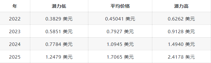 Trading Beasts 改变了预测;它现在预计 2022 年的最高收盘价为0.6483 美元。该公司将最低和平均年度收盘交易分别定为 0.4408 美元和0.5186 美元。预计 2023 年和 2025 年的平均收盘目标将突破0.4782 美元和0.4672 美元的水平。