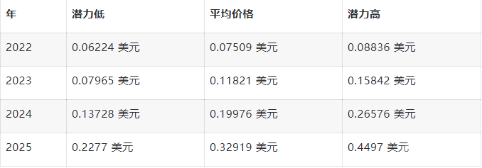 根据 Trading Beast 的 DOGE 价格预测,meme 代币预计将在 2022 年结束交易,最高目标为 0.1059 美元。该公司将最低和平均目标分别定为 0.07203 美元和 0.08474 美元。Trading Beasts 预测 2023 年和 2025 年的最高目标分别为 0.11425 美元和 0.1611 美元。