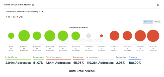 如果 meme 代币延续第三季度,则呈看涨趋势。主要接受和采用等进一步推动可能将价格推高至 0.06473 美元的潜在高位。乐观地说,根据Into The Block 的说法,有204万个地址是 In the Money,而184万个地址是没有钱的。虽然平均价格可能会保持在0.06100 美元左右,但空头可能会将价格压低至0.05685 美元。