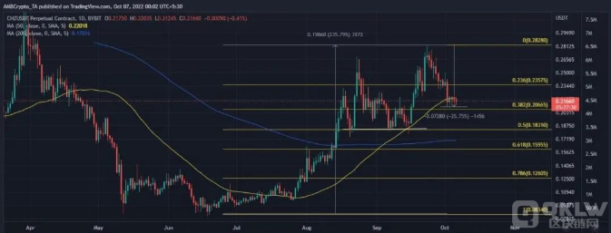 在从 9 月的峰值 0.282 美元回落 25%后,CHZ 本周早些时候触底至 0.208美元。