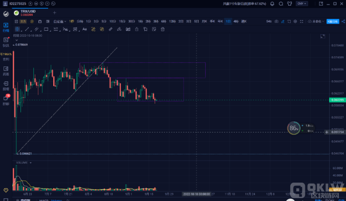 6月13日跌至0.04621后反弹形成一个震荡区间,震荡区内上涨曲折,破新高的幅度拖泥带水,8月15日一根阴线吞没前方6根K线,预示反弹结束出现反转,上周收了一个下降三法,行情恢复下跌趋势。整个震荡区反弹用了8周,但2周就收复了上涨空间,区间内2波上涨波第二波波幅弱于第一波波幅,下跌波第二波下跌明显强于第一波下跌的波幅,说明多军上涨动力不足,空军下跌势头越来越强。