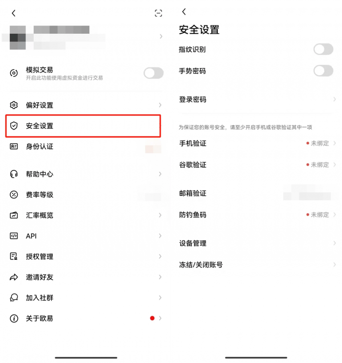 点击首页左上角个人中心,选择安全设置,并按提示完成相关验证开启操作。此外,您还可在此页面进行登录密码的修改、指纹识别/手势密码开启、防钓鱼码设置等,个人信息设置的越完善,越能够保障您的交易和账户安全。