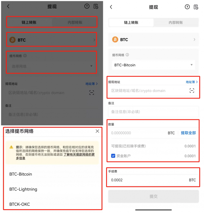 2. 选择需要提币的币种,例如BTC,选择提币方式,目前平台支持链上提现和内部转账两种提币方式,链上提现需要选择并确定提现网络,输入提现地址,提币数量以及手续费。