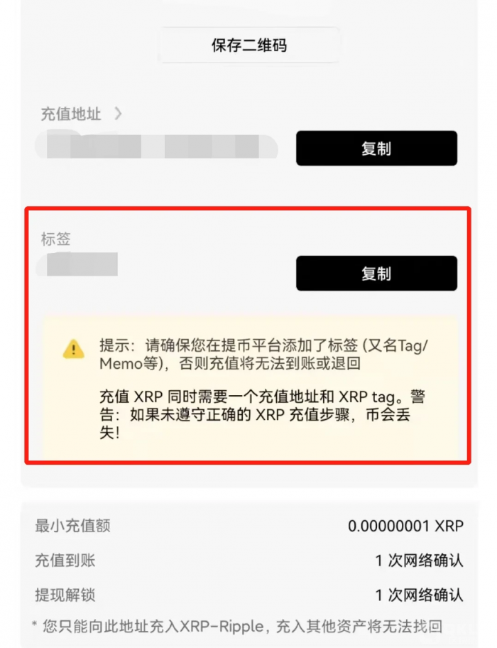 6. 部分币种在生成提现地址时会同时生成标签(Memo/Tag),例如XRP,标签通常是一串数字,提现这些币种时必须需要填写提现地址和标签,否则提现不会到账。