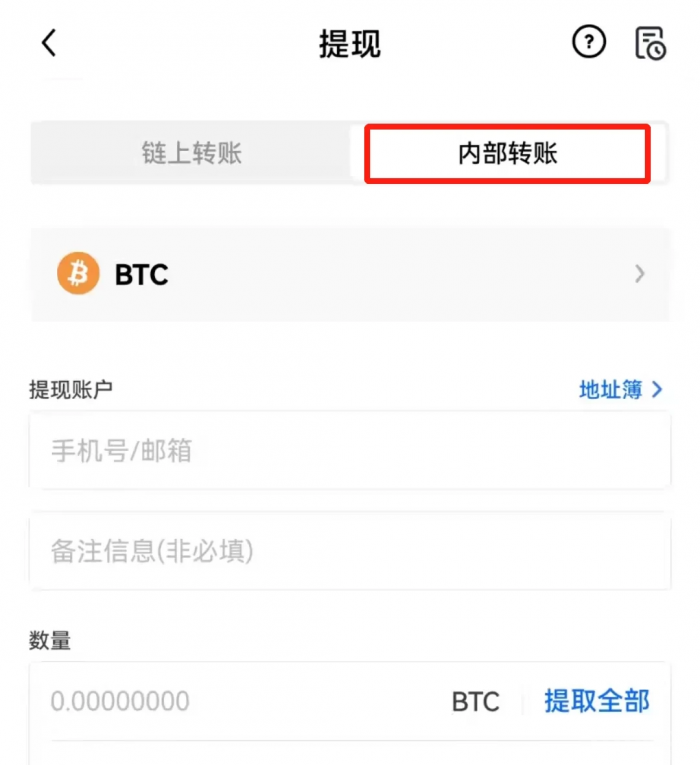 3. 若进行内部转账需要输入提现账户、提币数量。内部转账仅限同为欧易平台用户之间进行操作。