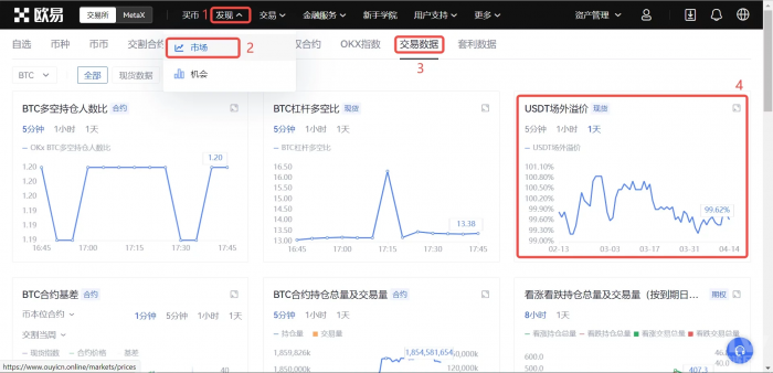 由于不同平台的资金流入流出会有差异,所以USDT的溢价也会有差异。那么如何查看欧易的USDT场外溢价率呢?您可以在欧易官网点击【发现】-【市场】-【交易数据】查看,也可以在APP点击【发现】-【数据】查看。