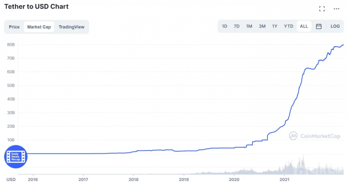 2020年来,USDT的增发速度远超往年,推动USDT的市值暴增。截至2022年4月,USDT市值突破827亿美元,位列加密市场市值第三名,仅次于比特币和以太坊,是目前市场份额最大的稳定币。USDT提供了极强的流动性,其日换手率通常高达200%至500%,日交易额可达五百亿至千亿美元。