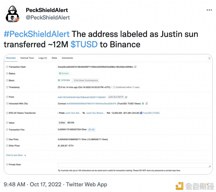 安全团队:孙宇晨地址将1200万枚TUSD转移至币安