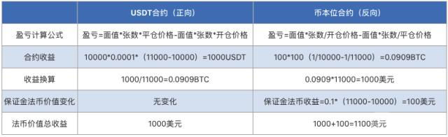 通过计算,USDT保证金合约与币本位保证金合约在币价上涨时,多单同时获利,但换算成法币收益后,币本位合约的收益要比USDT合约收益多100美元,币本位合约相较于USDT合约的收益增加幅度与币价上涨幅度相同。