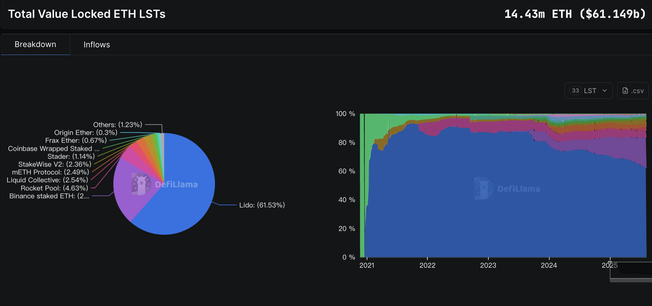 这不仅利好质押本身,更激活了一整套基于质押的 DeFi 生态:从 LST 抵押借贷、收益聚合、再质押机制,到基于 staking 构建的收益衍生品等。更重要的是,美国监管明确意味着机构可合法地参与质押及相关产品配置。ETH 当前在流动质押中的锁仓量约 1440 万枚,且增长加速。据 Defillama 的数据,2025 年 4 月至 8 月,LST 锁仓 TVL 已从 200 亿美元飙升至 610 亿美元,重回历史高点。