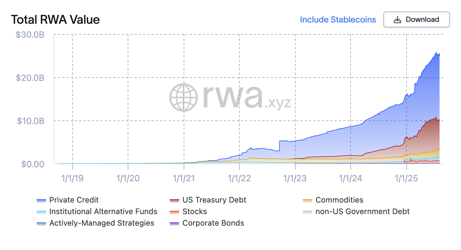 历史上几乎没有与美国国债的深度、稳定性和信用质量相匹配的资产。优质政府债券是机构投资组合的基石,用于安全存放资本并作为其他投资的抵押品。加密世界利用这些相同的基本面,自稳定币成为加密的最大出入口之后,双方的关系比任何时候还要深。