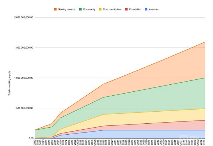 目前,质押奖励最高年化利率为7%,并在每个epoch进行评估,每年下降1.5%,直到降到每年3.25%(预计需要 50 年以上)。这些奖励增加了APT代币的总供应量,其增加幅度取决于质押的APT数量和验证节点运营情况。