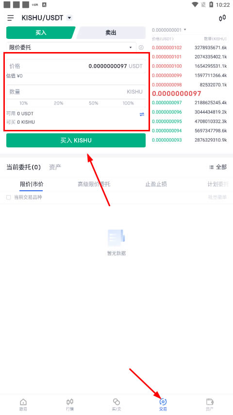 第四个Tab——“交易”, 用 usdt 可以买 shib设置买入价格和买入数量,成交后即可将USDT换成kishu。