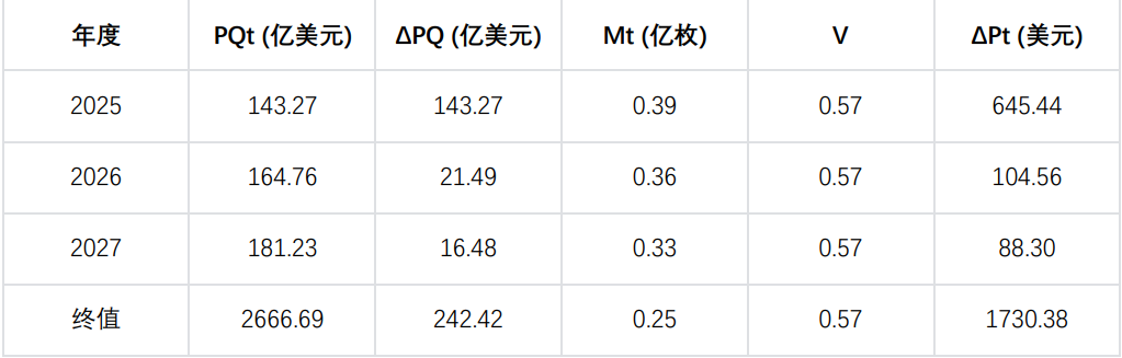 BNB 的流转速率难以直接测算。我们采⽤倒推法:通过 2024 年实际市场价格、PQ 和 M₀,反推出 V 的基准值为 0.57。对未来年份可设定±10% 上下区间,并在后续敏感性分析中验证其对估值的影响。