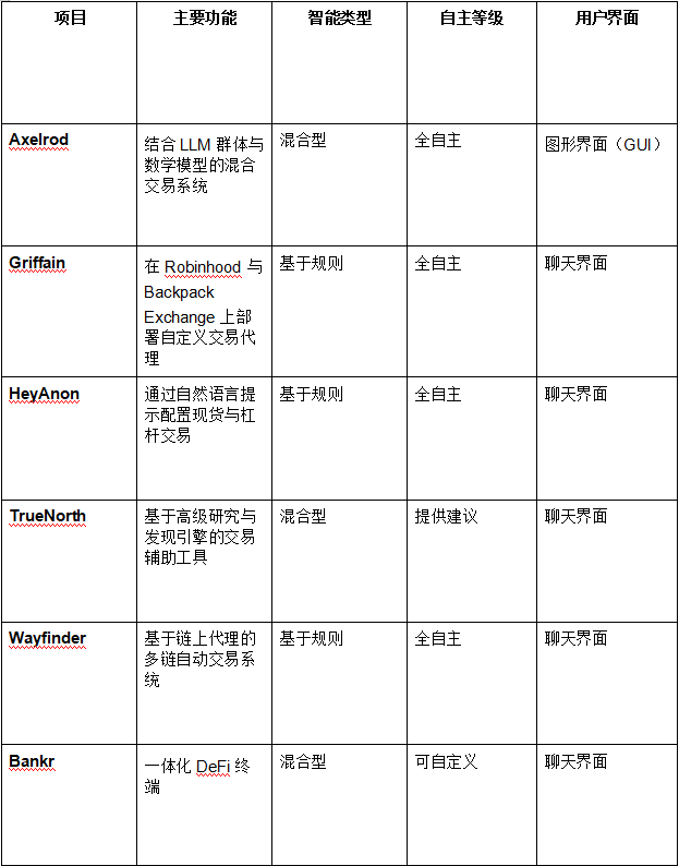 以下为当前已上线、具备资金管理能力并面向用户开放的 Agentic 项目列表。处于开发或内部测试阶段的项目不在列,同时,仅使用 LLM 作为界面、但需用户手动决策的产品也被排除,因此不少项目未被纳入本轮盘点。