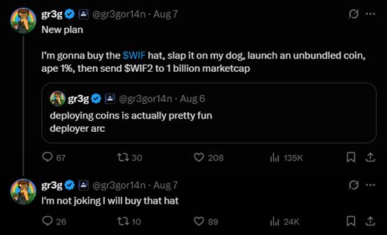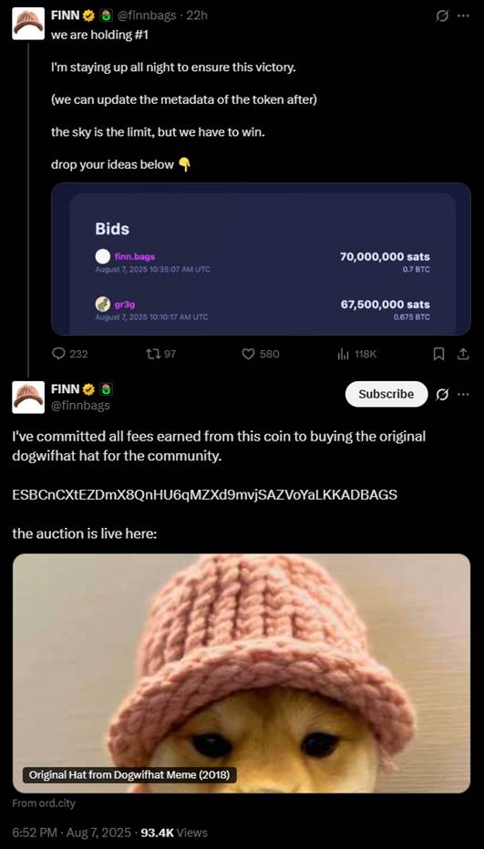 在这场竞拍中,另一个有力的竞争者是 @gr3gor14n。他的最高出价一度来到 6.6 比特币。他在 Twitter 上表示,他的计划是买下这顶帽子,然后把帽子戴在自己的狗的头上,并发射一个无捆绑的 $WIF2 币。