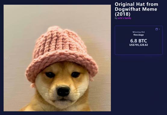 80 万美元的溢价,是 meme 的原味价值。@finnbags 拍下的这顶,是 Solana 上著名的 meme 币 $WIF(dogwifhat) 在 2018 年的原型 meme 中所出现的那顶。现在,这顶帽子将永远从上图这只可爱小狗的头上离开,到 Bags 的手中。