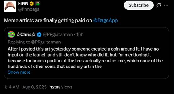 在今天上午,@finnbags 又发表推文,宣布将为 Bags 平台上第一枚突破 1000 万美元市值且保持 24 小时的 meme 币提供 25 万美元的奖励,获胜代币的 dev 和持有者都可以分享到这笔奖励。