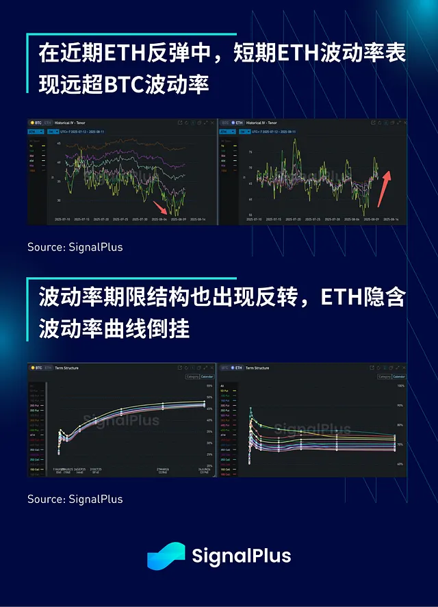 ETH 近期的反弹也导致了短期波动率的分化,比特币的隐含波动率仍徘徊在历史低位附近,而 ETH 的波动率则大幅跃升。ETH 的期限结构目前也呈倒挂状态,长期波动率预期将回落至~70% 区间,而 BTC 的 IV 曲线则相反,短期波动率被严重压缩,现货市场停留在 12 万美元左右。
