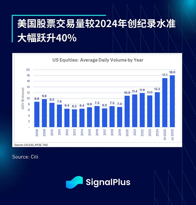 2025 年美国股市交易量创下历史新高,远超往年,这主要得益于年初至今零售交易的强势回归。据花旗资料,2025 年上半年的平均日交易量比前五年平均水准高出近 50%,较 2024 年创下的前纪录大幅跃升 40%。这一趋势在 7 月份得以延续,平均日交易量达到 180 亿股。