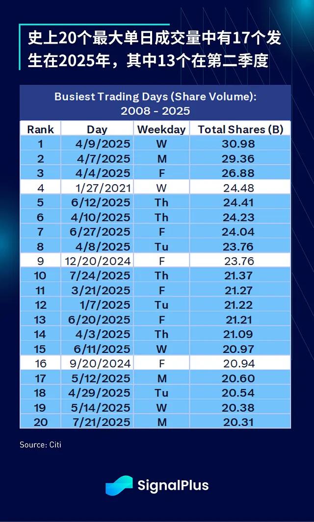 事实上,2025 年表现如此惊人,历史上 20 个最大单日成交量中有 17 个发生在 2025 年,其中仅第二季度就有 13 天。绝对令人难以置信。