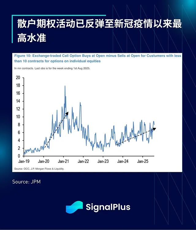 年初至今,散户参与度推动了极高的个股集中度,2025 年某些交易日中,前五大股票成交量占市场总成交量的比例超过 20%。散户在认购期权(call option)上的活动也大幅反弹,达到自新冠疫情以来的最高水准。