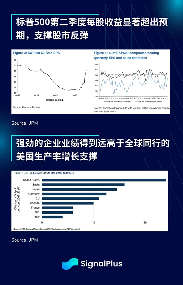 在财报方面,已公布业绩的标普 500 公司中约 80% 超出预期,同比增长 12%,超预期幅度达 9%,由科技和金融板块领涨。在关税担忧之后预期被调低的背景下,2025 年第二季度每股收益显著超出预期。