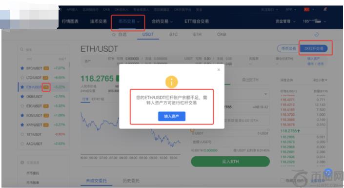 方法1:在「币币交易」界面,在左侧币对选择栏有“5X”标记的币对,选择”5X杠杆交易”,点击“转入资产”,将资金从币币账户转入币币杠杆账户;