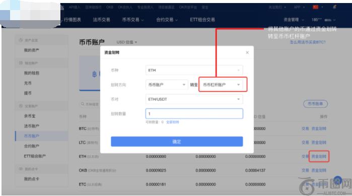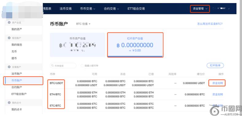 方法2:也可以在「资金管理」界面选择「币币杠杆账户」,选择您想操作的币对,进行资金转入。