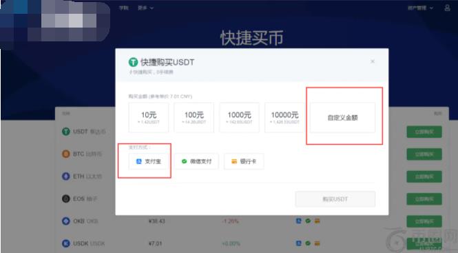 3.在弹出的窗口中,点击自定义金额,可自行填金额,也可以直接选择预设的整数金额。支付方式可以自选,一般支付宝就挺好。填好后点击右下角的购买USDT按钮。(本教程以USDT为例)