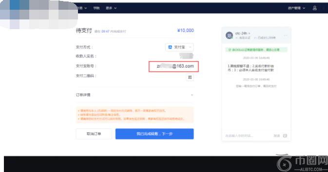 4.由于政策原因,现在买币都是场外交易的。(但交易安全性绝对可靠,几大平台都很靠谱)按上面的支付宝帐号转入相应的金额给指定的人。记得核对一下收款人实名是否一致,以防转错帐号。
